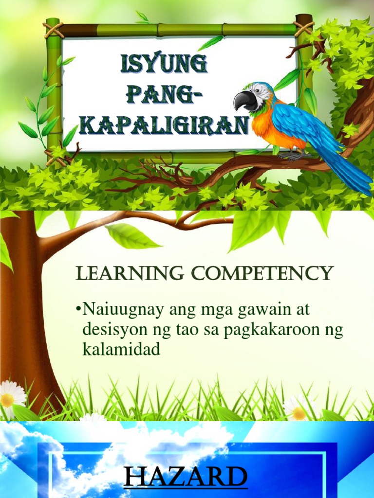 Slogan tungkol sa pangkapaligiran at paghahanda sa kalamidad Slogan tungkol sa pangkapaligiran at paghahanda sa kalamidad. Kilala ang Pilipinas bilang isang agrikultural na bansa. 3Itala ang mahahalagang pangyayari sa bawat aspeto nito mula sa.