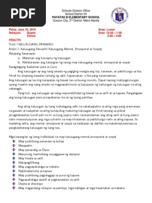 DepEd TeleRadyo Grade 5 MAPEH Health 5 KALUSUGANG EMOSYONAL MENTAL AT SOSYAL Quarter 1 Module 1 Brought to you by Herculina L. Katulad din ng sosyal na aspeto itoy para magkakaroon siya ng pamantayan ng buhay. NayTay si Ate po kinuha yung laruan koTay.